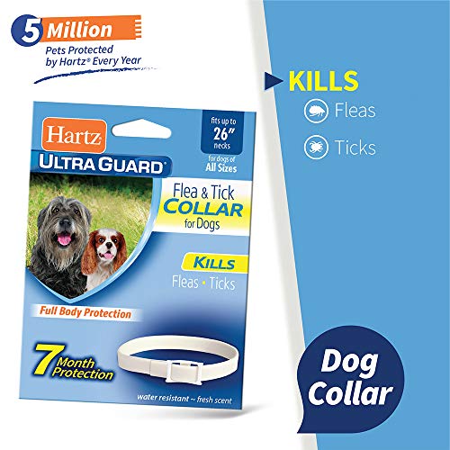 Tell pesky parasites to ‘bug off’ with the Hartz UltraGuard Flea & Tick Collar for Dogs and Puppies. This fresh scented collar kills and repels fleas and ticks on pups with necks up to 26 inches for 7 continuous months. The water resistant design remains effective even after playtime in the rain. For continuous flea and tick protection from head to tail, replace the collar every 7 months. Directions: Remove collar from package, unroll and stretch to activate insecticide generator. Do not use on puppies under 6 weeks of age. Do not unroll collar until ready to use. Place the collar around the dog’s neck, adjust for proper fit and buckle in place. The collar must be worn loosely to allow for growth of the dog and to permit the collar to move about the neck. Generally, a properly fitted collar is one that, when fastened, will snugly slide over the dog’s head. Leave 2 or 3 inches on the collar for extra adjustment and cut off and dispose of the extra length. Consult a veterinarian before using this product on debilitated, aged or medicated pets. Sensitivity may occur after using any pesticide product for pets. Some animals may become irritated by the collar if it is applied too tightly. If this occurs, loosen the collar. If irritation continues, remove the collar and bathe your dog with mild soap and rinse with large amount of water. If signs continue, consult a veterinarian immediately. Do not use this product on dogs simultaneously or within 30 days before or after treatment of other flea and tick products. However, flea and tick collars may be replaced immediately.Features:
