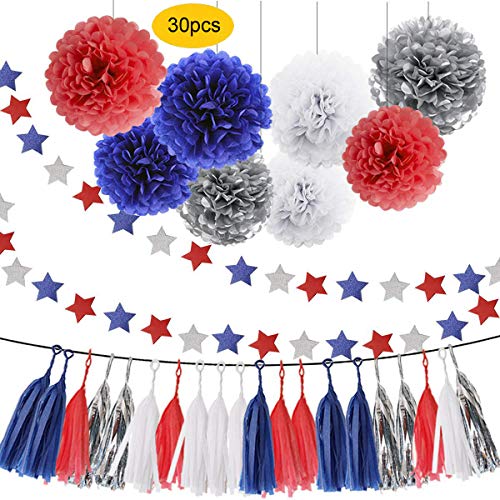 Heartfeel Part#: H-NP-13 717760646620 - HEARTFEEL 30pcs Patriotic Tissue Paper Pom Pom Silver Navy Blue Red White Tassel Garland Party Decorations (Navy Blue Red Silver White)