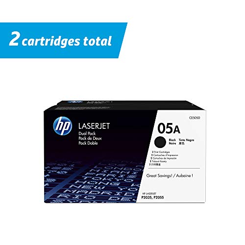 HP 5A (CE505D) Black Toner, 2 Cartridges. HP 05A (CE505A) toner cartridges work with: HP LaserJet P2055 P2055d P2055dn P2055x. Original HP toner cartridges produce an average of 71% more usable pages than non-HP cartridges. HP 05A toner cartridge yield (approx. ) per cartridge: 2, 300 pages. 05A toner is designed to work with your HP printer for high quality, reliable results every print. Ensure that your printing is right the first time and every time with HP printer toner: 05A toner. What’s in the box: HP 05A toner cartridges (2 Black). Color: Black.Features: