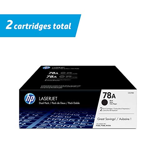 HP 78A (CE278D) Black Toner, 2 Cartridges. HP 78A (CE278D) toner cartridges work with: HP LaserJet Pro M1536, P1606. Original HP toner cartridges produce an average of 71% more usable pages than non-HP cartridges. HP 78A toner cartridge yield (approx.) per cartridge: 2,100 pages. 78A toner is designed to work with your HP printer for high quality, reliable results every print. Ensure that your printing is right the first time and every time with HP printer toner: 78A toner. What’s in the box: HP 78A toner cartridges (2 Black). Color: Black.Features: