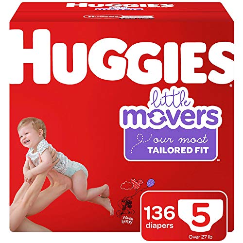 - Featuring adorable Disney designs, HUGGIES Little Movers diapers Size 5 fits babies over 27 lb.