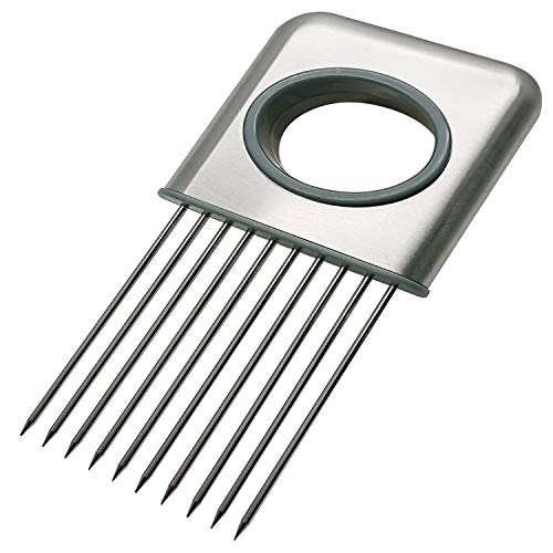 - This all-in-one kitchen gadget allows you to chop uniform slices of onion without having to ever touch it. See images above. It features ultra-sharp stainless steel tines that pierce even the hardest vegetables like carrots & potatoes. Just place your blade between the tines and slice away!