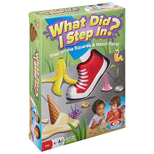 Ideal What did I step In? Game is a fun memory game for 2-4 players! Each player receives 3 cards from a draw pile, then using a sneaker with a suction cup on the bottom, tries to find matches from the spread of mystery cards. Just slam the shoe on a random card and look on the bottom to see what you stepped on. If it’s a match, you score a point! There are also lucky coins to add to your score, but watch out for the dog poop! That’s like losing a turn. And stinky! Whoever has the most points when all cards are paired, wins. Includes suction shoe, 21 draw cards, 28 mystery cards and instructions. Recommended for children 4 years of age and older.Features: