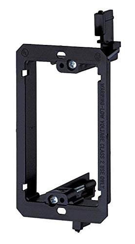 This Low Voltage Mounting Bracket, 1-Gang, Black, 1-Pack. Mounting bracket has Oval holes that allow final shifting and straightening. Easy to install, for mounting low voltage wires(phone, internet, TV, video). Adjusts to fit various wall thickness, the bracket wings secure when mounting screws are tightened. Bracket is its own template for cut-out, trace the bracket then cut the hole, includes 1 low voltage mounting brackets. Horizontal or vertical mounting, installs faster and costs less than metal brackets, Impact Resistant Plastic results in less breakage on Job site. Protects cable as it runs through the knockouts in metal studs.Features: