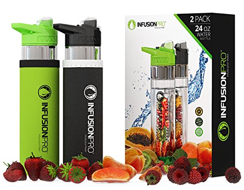Infusion Pro Premium Fruit Infused Water Bottle (2 Pack or 1 Pack) Insulating Sleeves and Flavored Water Recipe eBook Included, Bottom Infuser Style with Flip Top Lid - 24 oz BPA Free Tritan Plastic