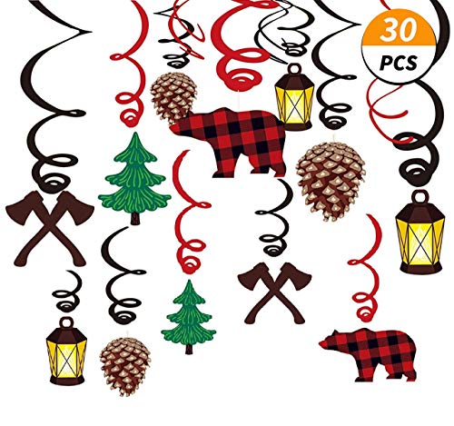 Kristin Paradise 30Ct Lumberjack Hanging Swirl Decorations, Buffalo Plaid Ceiling Streamers, Camping Theme Birthday Party Supplies, Baby Shower Red Decor, Boy/Girl/Kids 1st First Themed Favors Set