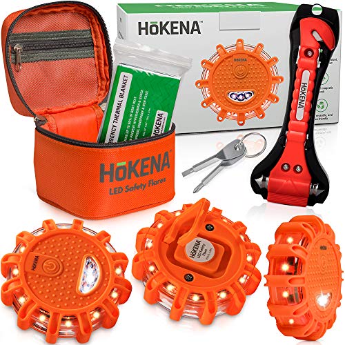 Hokena Part#: FL-1801 689353803591 - HOKENA LED Road Flares Emergency Lights - Roadside Warning Car Safety Flare Kit for Vehicles & Boat | 3 Beacon Disc Pack with Tools for Easy Battery Replacement & Bonus Seatbelt Cutter