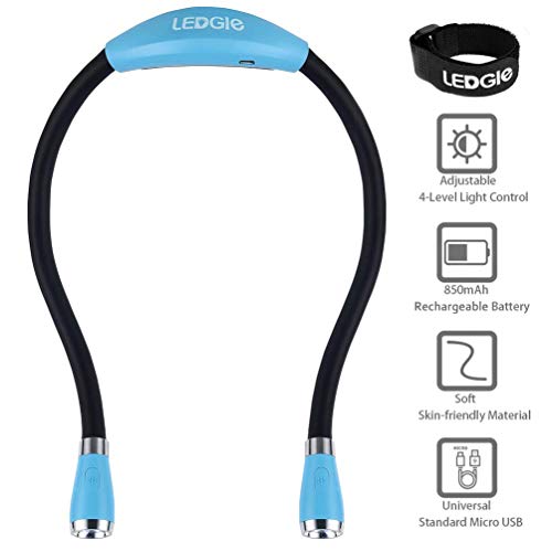 LEDGLE Rechargeable LED Book Light, Hands Free, USB Cable Included for Bed Reading or Read in Car, Flexible Arm, 4 Super Bright LED Bulbs, 4-Level Light Control(Light Blue-Upgrade)