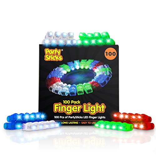 Get even more flashy LED fun with this glow-in-the-dark party supplies pack of 100 finger lights in red, white, blue and green! Put on these party lights with the convenient rubber-band strap and press the button for a lively light show at your next birthday party, concert or special event.FUN PARTY FAVORS FOR KIDS & GROWNUPS. You're never too old for glow-in-the-dark goodies, and these finger lights fit digits both large and small.