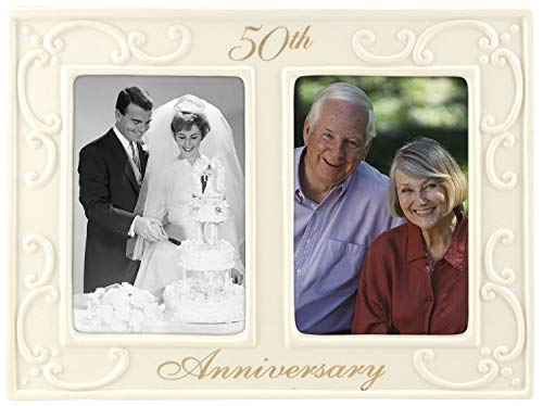 Our 50th Anniversary frame is a special double to celebrate then and now. Contemporary ceramic picture frame with a romantic swirl design, has two 3-inchx5-inch openings to hold a wedding and anniversary photo. Etching on the frame is inscribed with gold-leaf 50th Anniversary.Features: