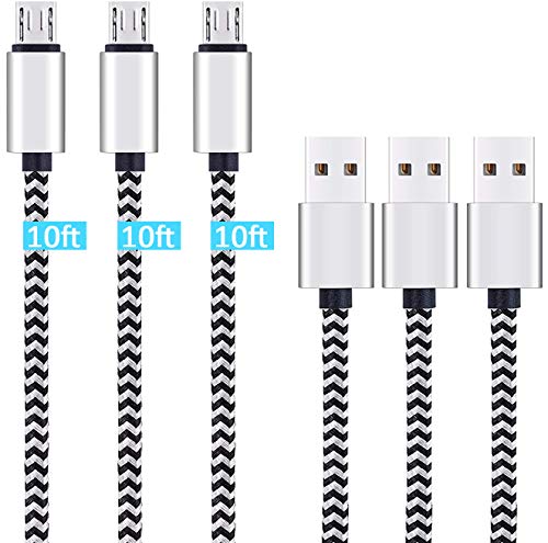Micro USB Cable 10ft 3Pack by Ailun High Speed 2.0 USB A Male to Micro USB Sync Charging Nylon Braided Cable for Android Phone Charger Cable Tablets Wall and Car Charger Connection Silver&Blackwhite