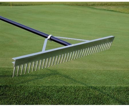 Seymour Midwest Rake Landscape Rakes have rounded teeth which provide a smooth non-gouging raking action, while its striking edge is excellent for grading. Strong wraparound bracing and heavy-duty double rib construction maximizes head stability and ensures long-lasting performance, even under the heaviest professional use. 66" powder-coated aluminum handle with vinyl grip. Head size is 30". Made in USA.Features: