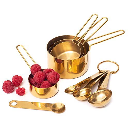 - ✔ THE ONLY SET YOU NEED - Sophisticated, on-trend with gold and brass kitchen decor, this 8-piece set of gold / brass measuring cups and spoons complete with measurement markings, in sturdy stainless steel will glam up your culinary & baking experiences. Each set is held together with an easy to open gold ring and neatly nests for space saving storage. Comes with 1/4 tsp, 1/2 tsp, 1 tsp and 1 tbsp measurements for the spoons and 1/4 cup, 1/2 cup, 1/3 cup and 1-cup measurements for the cups.