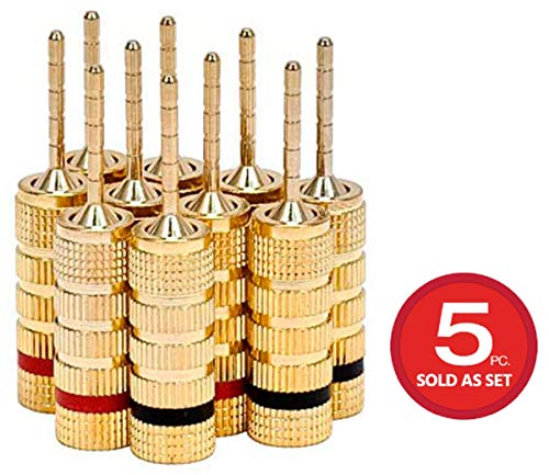 Pin plugs make speaker installation a breeze. They are designed for use with amplifiers or speakers fitted with either traditional binding posts or spring clip connectors. Not only is it easier to make the connection on the back of your amp, it is safer, with no chance of stray wire strands creating a short across contacts. These high quality plugs are the closed screw type and can accept bare wire or spades. They are sized to fit speaker wire from 12 to 18 AWG. Each pair comes with one plug color coded red and the other coded black, for easy polarity identification. The plug body is made of brass, which is then plated with gold to help prevent corrosion and ensure smooth connections. This multi-pack includes five pairs of plugs, perfect for connecting the satellite and center channel speakers in a 5.1 channel setup.Features:
