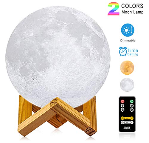 - Moon lamp with 2 colors, warm yellow and white LED light, Adjustable brightness, with time setting; you can use the timer on the remote control to fix the moon light light for 15/30/45/60 mins, dreamlike and creative decorative lights, a favorite gift for your friends or lover;
