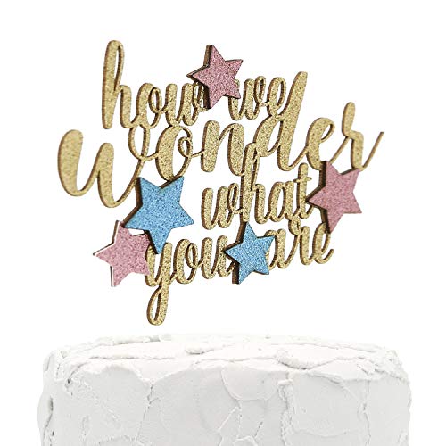 NANASUKO Gender Reveal Cake Topper - How we Wonder What You are - Premium Quality Made in USA - Double Sided Gold Glitter with Pink and Blue Stars