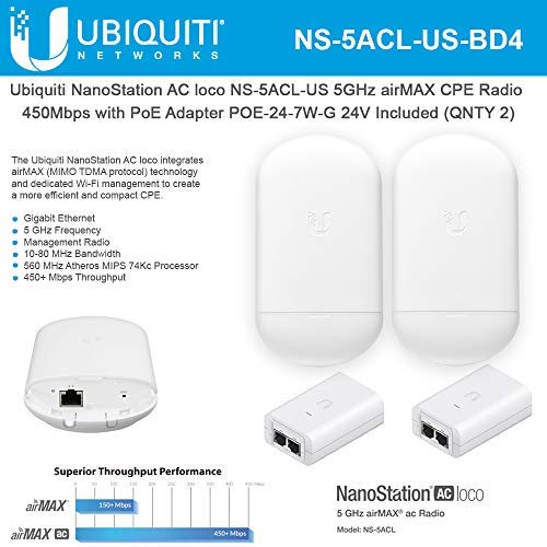 - NanoStation AC loco NS-5ACL-US (QNTY 2) 5GHz 802.11ac airMAX CPE Radio 450Mbps Wireless Access Point with PoE POE-24-12W-G Included (QNTY 2)