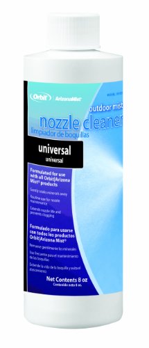 The orbit/Arizona mist 8-ounce misting nozzle cleaner is formulated for use with all orbit/Arizona mist products. Place misting nozzles in a glass bowl outdoors and soak in nozzle cleaner for 30 mins. Rinse the nozzles before reinstalling.Features: