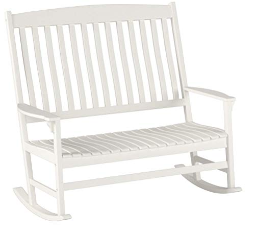 Outdoor Seats 2 Porch Double Rocking Chair White . Double Rocking Chair gives you a comfortable place to relax on your porch or patio and enjoy the outdoors. Constructed of solid hardwood, this White Outdoor Rocking Chair is wide enough to comfortably seat two people. This White Wood Rocking Chair is weather treated to help it hold up in outdoor elements such as rain and snow. The backrest slats of the Outdoor Double Rocking Chair provide support, and you can add a cushion if desired for extra comfort. The White Outdoor Rocking Chair has a weight capacity of up to 550 lbs. Outdoor Double Rocking Chair, White, Seats 2: Durably constructed of solid hardwood Comfortable wide seat and backrest slats Weather treated for long-lasting outdoor use Assembly required Dimensions: 46.75"L x 31.5"W x 44.5"H 1-year warranty Supports up to 550 lbsFeatures: