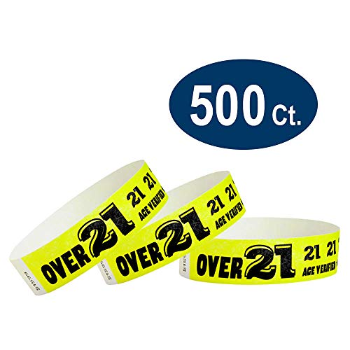 - 500 OVER 21 NEON YELLOW 3/4 INCH TYVEK WRISTBANDS FROM WRISTCO - The 500 wristbands are packaged in sheets of ten. Each wristband measures 3/4 inches wide by 10 inches long and will fit most wrists. Each armband is numbered for security and identification.
