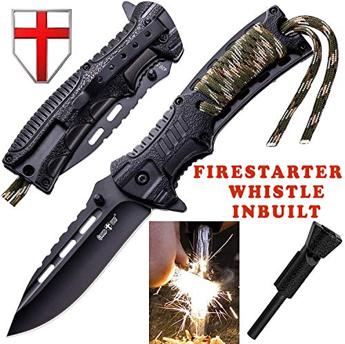 Pocket Knife - Tactical Folding Knife - Spring Assisted Knife with Fire Starter & Paracord Handle - Best EDC Survival Hiking Camping Knife for Army Military Emergency Outdoor Rescue - GrandWay 6772