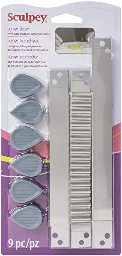 POLYFORM-Sculpey Super Slicer Set. This set contains four blades for slicing clay and creating a variety of design edges or cuts. Safety handles that snap off for use on all blades are also included. This package contains two safety handles and four metal blades: Rigid; Flexible; Rick Rack; Wave. Caution: Blades are extremely sharp. Handle with care. Imported.Features: