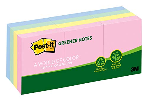 Post-it Greener Notes, 12 Pads/Pack, 1 ½ in. x 2 in, 100% Recycled Paper and a Plant-Based Adhesive, Assorted Helsinki Colors (653-RPA)