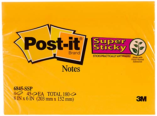 Post-it Super Sticky Notes, Bright Neons, Call out Important Information, Recyclable, 6 in. x 8 in, 4 Pads/Pack, 45 Sheets/Pad (6845-SSP)