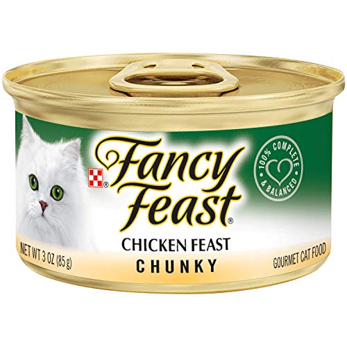 Entice your cat with the tempting taste of poultry when you serve Purina Fancy Feast Chunky Chicken Feast wet cat food. Tender chunks of chicken surrounded in a finely ground pate provide a palate-pleasing combination of textures your cat is sure to love, and the high-quality ingredients in this grain-free cat food deliver an exceptional level of taste in every mouthwatering bite. With its appealing appearance, this gourmet wet cat food keeps your cat engaged during feedings. Essential vitamins and minerals help to support her overall health and wellness, so you can feel good about the foods you put in her dish. Make mealtime a special time you share with your cat when you fill her dish with this delectable wet cat food and let her explore our other Fancy Feast Chunky recipes, including Turkey Feast and Chopped Grill Feast, to give her delicious choices at mealtime. Don't make her wait for dinner. Get her food to her fast when you order Purina Fancy Feast from Amazon.com now.Features: