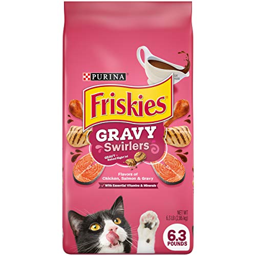Bring the deliciousness of gravy mixed with two cat-favorite flavors to your cat's dish with Purina Friskies Gravy Swirlers dry cat food. Savory chicken and salmon flavors combine to create the taste cats crave, and there's gravy baked into each bite for added yum. Let the sound of the mouthwatering kibble hitting her bowl pique your cat's attention, and watch as she delights in every last delicious bite. This dry cat food recipe features essential vitamins and minerals for the everyday nutrition your cat needs to be her best self. Because it's formulated for all life stages, this mouthwatering meal can follow your cat companion from her playful kitten days all the way through to her adventurous adult years. Give your cat the 100% complete and balanced nutrition she deserves along with the taste she adores every time you offer up a helping of this Purina dry cat food. Fill your cart with Purina Friskies Gravy Swirlers to be one step closer to filling her dish with a taste she loves.Features: