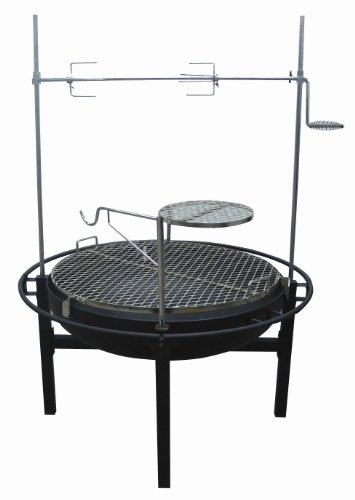 The Rancher fire pit grill has a 730 square inch primary cooking surface. The fire bowl is heavy duty 4mm thick for a long life with a drain pipe on the bottom. The grill comes with height adjustable rotisserie, double nickel plated cooking grate, swivel work table, and adjustable pot hanger hook.Features: