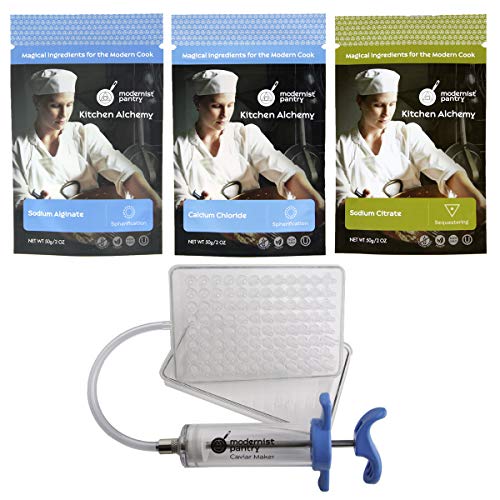 Create spherified "caviar" in no time at all. This handy tool saves tons of time and effort by dispensing 96 droplets of spherification liquid at a time. Includes complete instructions, caviar maker, plastic tubing, 35cc syringe, and enough ingredients to make 17 cups of caviar: 50g Sodium Alginate 50g Calcium Chloride 50g Sodium CitrateFeatures: