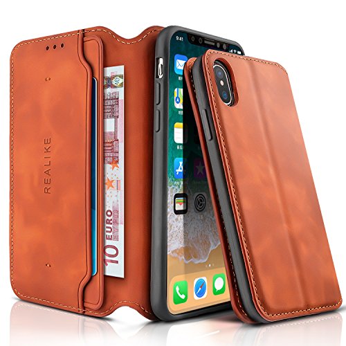 REALIKE iPhone X Wallet Case iPhone PU Leather Case iPhone X Flip Cover Case with Card Slot Holder Pocket Shockproof Protection Magnetic Closed Case for Men and Women-Tan