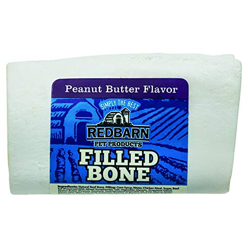 Rebarn's Peanut Butter Filled Bones are white, hard femur bones filled with tasty peanut butter filling. Not only will your dog will be drawn to the peanut butter flavor, but chewing on the hard outer bone will help clean his teeth. Small size bones measure approximately 3 1/2 inches tall and 2 inches across. Redbarn Filled Bones are made in the USA. Approximately 3.5" tall, 2" wide White, cut femur bone filled with delicious peanut butter filling Chewing on tough treats promotes dental healthFeatures: