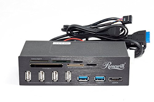 The Rosewill RCR-IM5001 Card Reader is designed to install neatly into a 5.25" drive bay on your desktop to give you convenient access. This six-slot reader accepts most available cards in a single location. Additional USB ports and an eSATA port are also included for extra connectivity. The Rosewill RDCR-11004 card reader features six slots to provide an ideal solution for easy and quick access to most available cards, including CF/ CF II, SD, MMC, SM, xD, MS, MS Duo, and more. The Rosewill RDCR-11004 features an eSATA, two USB 3.0, and four USB 2.0 ports on the front panel for easy access to external USB and eSATA devices.Features: