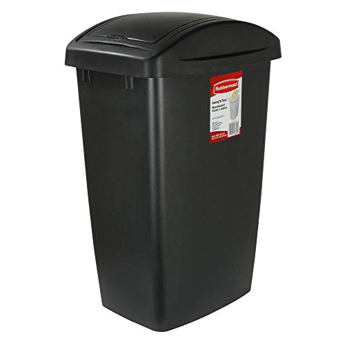 Rubbermaid Swing-Top Lid Recycling Bin for Home, Kitchen, and Bathroom, 12.5 Gallon, Black with Recycling Logo features a duel-action lid that swings in or lifts up for convenient trash disposal. Use this container for keeping garbage out of sight, or to collect recycling to help protect the environment. The durable seamless construction and strong resin material make this can long lasting and easy to clean. Rubbermaid's timeless designs are perfect for any room in the home, be it bedroom, nursery, garage, foyer, or kitchen; great for business purposes as well. This wastebasket was designed with convenience in mind. Large 12.5 gallon capacity means less trips to empty, and less bags needing to be bought. Recognized as a “Brand of the Century” by , Rubbermaid is one of only 100 companies named as having an impact on the American way of life. Rubbermaid products are made in Wooster, Ohio. Rubbermaid warrants to the original owner that this product is free from defects in material and workmanship for a period of one year from the date of the original purchase.Features: