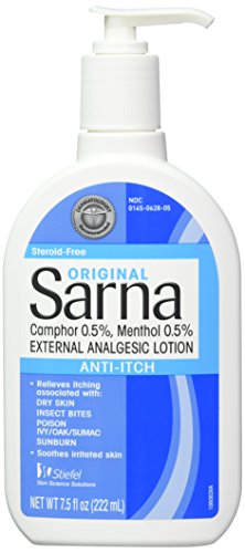 Fast-acting SARNA Original lotion contains menthol (0.5%) and camphor (0.5%) to cool and soothe itch while moisturizing the skin. It is designed to relieve the itch associated with general itch, dry skin, insect bites, sunburn and poison ivy/oak/sumac.And because it’s steroid free, it’s safe to use daily.Features: