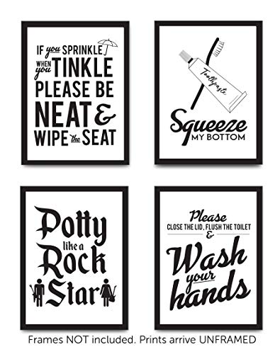 - ✔ MINIMALISTIC YET HILARIOUS ART PRINTS - These bathroom wall designs are set against a bright white background with black text for a sharper contrast. The typography is easy on the eye and is as playful as the words itself. Use them all in the same restroom or distribute them in separate ones and spread the fun!