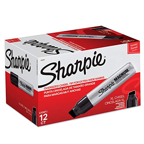 Sharpie 44001 Magnum Permanent Marker, Black. Durable, 3/4-inch felt chisel tip draws bold, highly visible lines. Specially formulated for both wet and oily surfaces, it is perfect for corrugate, wood, metal, foil, stone, plastic, leather and more. 2.5 inches long by 3.375 inches wide by 5.5 inches high. 0.71 pounds. Made in the USA.Features: