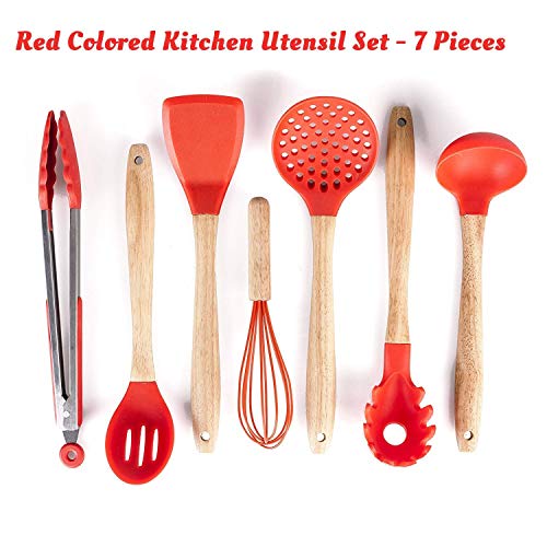 Silicone Cooking Utensils Set for Kitchen: 7 Piece Red Silicone Kitchen Utensil Set - BPA Free Heat Resistant Non Stick Silicone Tools with Wooden Handles - Kitchen Gadgets & Accessories Starter Sets