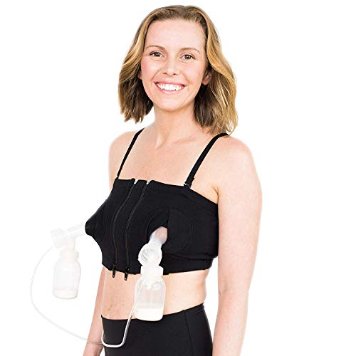 - CUSTOMIZABLE & CONVENIENT - This bustier style, hands-free breastpump bra has a zip-in center panel in the front that allows for 1" of side-to-side movement for proper positioning of pump flanges.