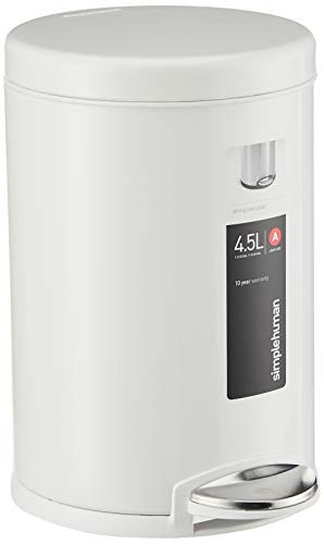 "Perfect Small Round Step Can The simplehuman 4. 5 Liter / 1. 2 Gallon compact stainless steel round step trash can is the ideal choice for any home's bathroom or office with its iconic round shape that fits in corners, against the wall – just about anywhere. And its stylish white steel finish enhances any home decor. Strong Steel Pedal The strong steel pedal means the can is hands-free and is engineered for a smooth and easy step. It also gives this waste bin stable operation for a ""big can feel. ""Custom Fit Trash Can Liners simplehuman Code A trash can liners are a perfect fit for this trash can. They are made from extra-durable plastic with thick double seams to prevent rips and tears and have been rated among the top in strength comparable to other major brands. Extra strong to keep garbage in the bag — not on the floor or the bottom of your trash can. "Features: