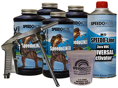 This sale is for 4 plastic quart bottles of Black Bed Liner (SMR-1000) and a quart of SMR-222 activator; which when mixed yields one gallon sprayable. Also included is a mixing cup for measuring activator and a free shutz spray gun to apply the bed liner. Note: If one gallon of sprayable bedliner is not enough for your job, then you may add SMR-1000-K1 from Amazon. The SMR-1000 is a 1.7 lbs/gallon voc and is the only bed liner that is 50 state compliant. SMR-1000 is a true 2K urethane with outstanding adhesion to steel and sanded paint. This coating is formulated to withstand the same atmospheric conditions as a high quality single stage urethane topcoat. FEATURES: .True 2K Urethane Durability .Uniform Jet Black Color .Excellent Exterior Stability from UV Light .Fast Dry .Chemical Resistant Finish Easy to use: ADD hardener - SHAKE - SPRAY (see instructions below) SURFACE PREPARATION: Surface should be cleaned of all grease, oil, dirt, rust, etc before sanding. Wash area with soap and warm water, then rinse and dry. Thoroughly clean area with Wax and Grease Remover. Scuff surface with 180-220 grit sandpaper. Re-clean with wax and grease remover, then dry with a clean towel. Instructions: Apply Bed Liner between 60 - 85 degrees F and humidity less than 70%, Not in direct sunlight. 1. Add 8 ounces of SMR-222 activator to a quart bottle of SMR-1000. 2. Screw on quart bottle cap and shake for two minutes. 3. Remove the cap and screw in the Shutz Spray Gun. 4. Adjusting the air pressure (60-80 PSI) and spray distance will change the texture. 5. Apply a uniform wet coat of bed liner using a sweeping motion. 6. After a 2 minute flash, apply a very light 2nd coat, sprayed at 80 PSI, using a fast sweeping motion.Features: