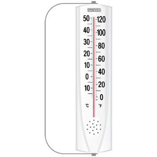 Watch the temps rise and fall with the Springfield Big and Bold Vertical Thermometer with Mounting Bracket. This 8.75-inch analog patio thermometer with side mounting bracket adds classic style and trustworthy temperature readings to your indoor or outdoor space. The low-profile body houses bold, easy-to-read graphics that indicate temperatures along the Fahrenheit and Celsius Scales. Quality, UV-fade-resistant graphics withstand the the harshness of the outdoor elements. Shatter- and weather-resistant, this thermometer is built to last. Bold and easy-to-read numbers surround the classic mercury-looking red liquid. A bright white background makes the sans serif black lettering even more legible from across the porch or yard.Features: