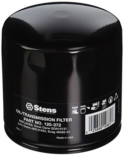 Stens 120-372 Transmission Filter. 1"-12 thread, 3 3/4" OD, 3 7/8" height, 10 micron. Replaces OEM Ariens 00669300, Bad Boy 063-8014-00, Gravely 00669300, 08841800, GDA10137, Great Dane D18094, GDA10137, John Deere M131053, Scag 48462-01, Snapper 2-7164, 7027164, 7027164YP, Toro 67-8110. Fits models Bad Boy 52", 60", and 72" Lightning Z, 2007, Gravely Pro Stance, Great Dane Hydro units, John Deere 647, 657, 667, 717, 727, 777, 797, ProGator 2020, 2020A, P2030 and 2030A, Scag Hydro units; SMTC, SMWC, SMZ, SMZC, SSZ, STC, STHM and STR-20CH, Snapper Hydro units, Toro Grounds master 300 series.Features: