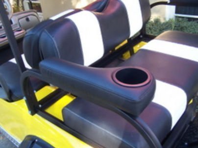 A set of black golf cart arm rests with built in cupholders. Made with a marine grade vinyl to withstand the weather elements. Comes with instructions and mounting hardware. Universal to fit most golf cart rear seat kits.Features: