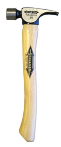 Stiletto finishing hammer, straight claw, 10 oz head, 14-1/2 in overall length, milled face, 1-1/4 in face diameter, titanium head, curved Axe handle, hickory handle, Brown/tan handle.Features:
