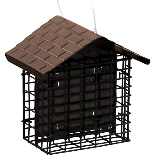 The Stokes Select Two Cake Suet Buffet with a Weather Guard roof is the perfect way to offer healthy treats to woodpeckers, nuthatches, chickadees and more! Suet is a high energy formulation of animal fat and other ingredients to attract insect eating birds in the winter months when food is not as plentiful. Two independent cages hold one suet cake each and feature an easy-open, double-locking closure system. Its shingle-patterned roof design diverts rain and snow, helping keep suet cakes dry. Its cage grid is designed with clinging birds in mind, but it’s not just for suet! It’s also perfect for small seed cakes, nesting materials in spring and oranges in summer. Constructed of solid steel with a weather resistant, black powder coated finish, the Two Cake Suet Buffet is a quality suet bird feeder that birds will love.Features: