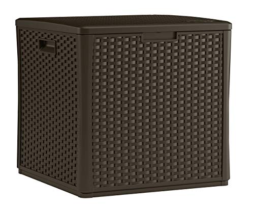 The Suncast wicker plastic storage container is an attractive and highly versatile solution for use throughout your home and yard. The chest design and hinged lid allow for easy access to your tools and accessories. With a holding capacity of 60 gallons (27" x 27.5" x 26"), the deck box is compact and space-efficient, easily tucked away in your laundry room or garage. Use it on your deck to stow away patio cushions, gardening tools and grill accessories, or in your house to store boots, gloves, hats, and more. The weatherproof body will resist fading, while the rain water flows off of the box without pooling to keep your belongings dry and mildew-free. Constructed with durable and waterproof resin that is built to last a lifetime.Features: