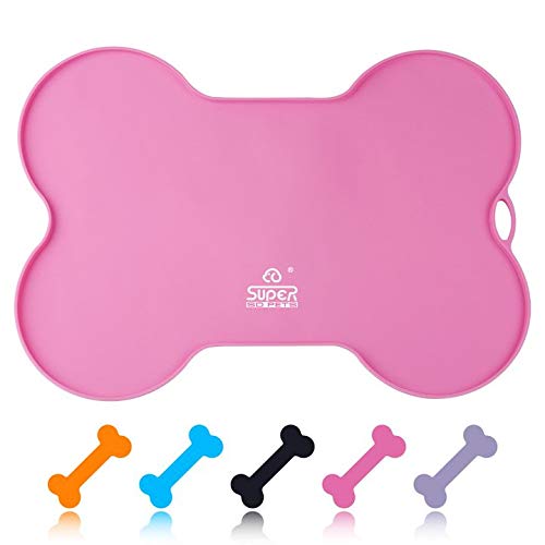 Super Design Silicone Waterproof Placemat - Bone Shaped Pet Feeding Mat, FDA Grade Silicone Raised Lip Non Spill Dog Cat Bowl Mat Pink